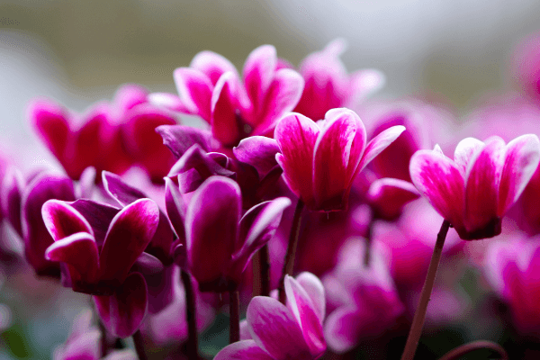 Com suas pétalas invertidas de cores vibrantes, o ciclame é uma planta que aprecia o clima mais frio. Após a floração, entra em dormência, mas volta a brotar na primavera seguinte.